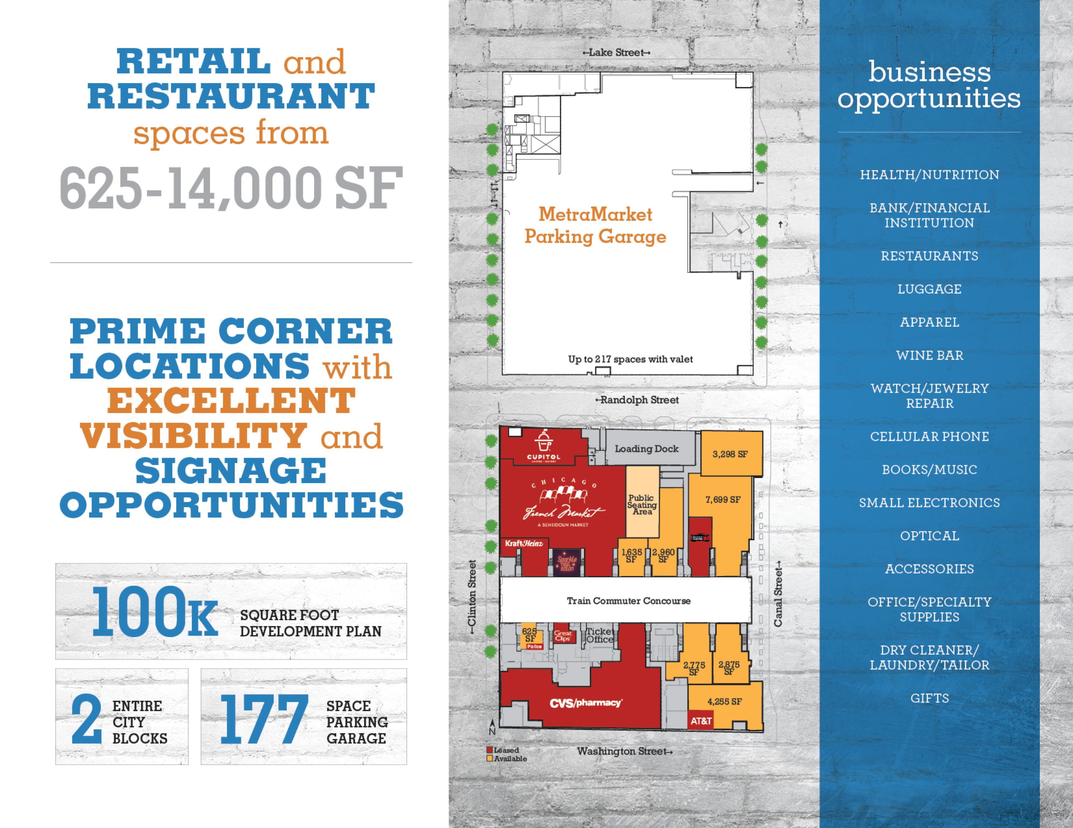 Located in the city’s burgeoning West Loop/Fulton River District residential neighborhood and office market, MetraMarket tenants include Chicago French Market, Cupitol Coffee and Eatery, Booze Caboose, Great Clips, and Sparkle Nail Salon, and is the perfect location for a variety of unique restaurants, retail stores, boutique shops, and neighborhood service providers.
